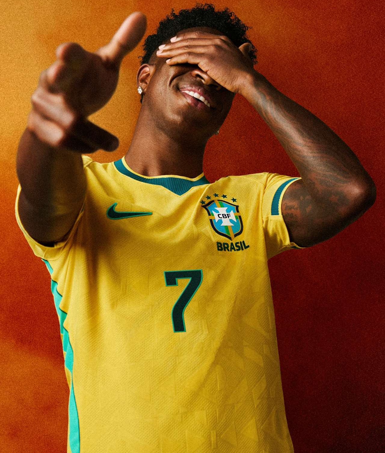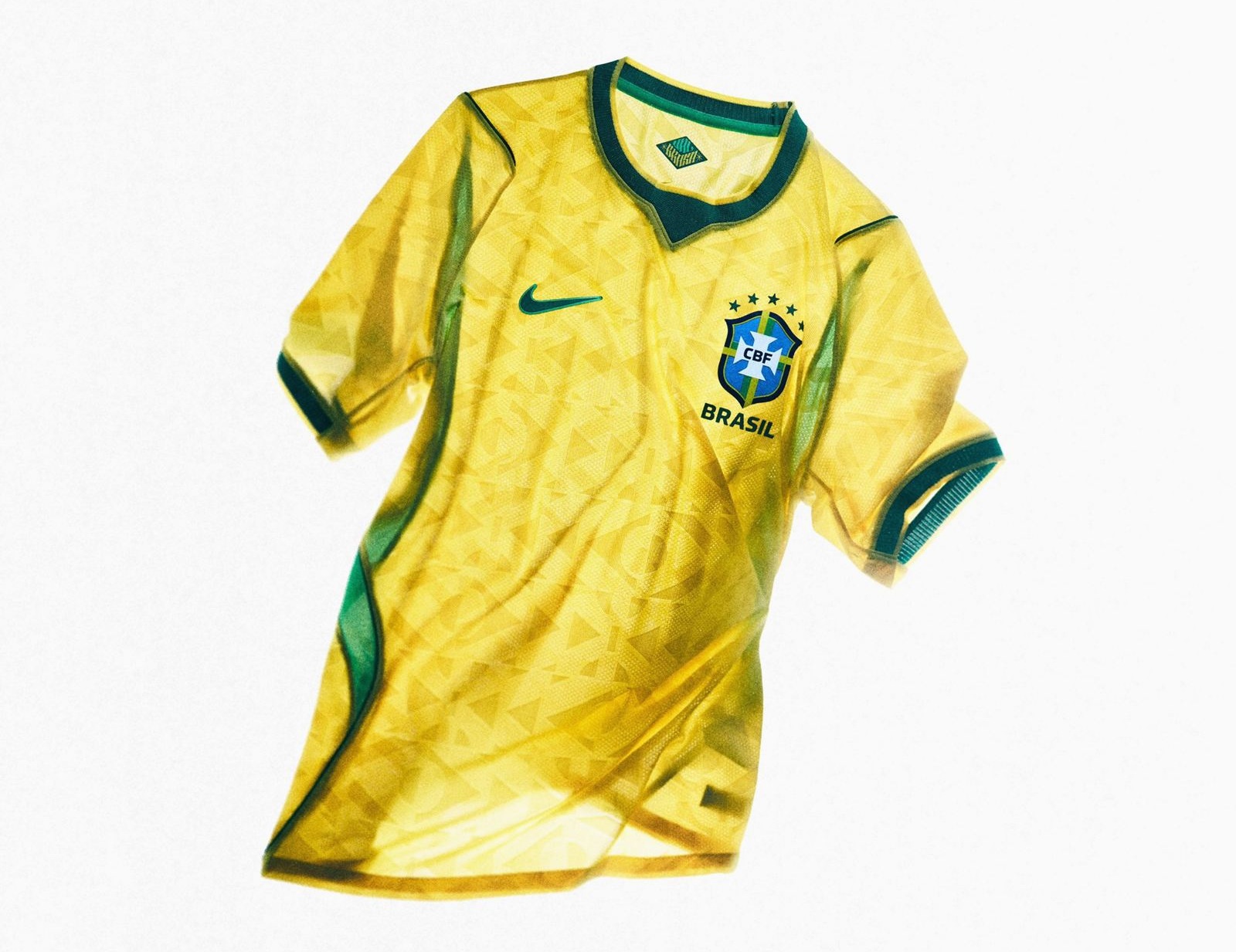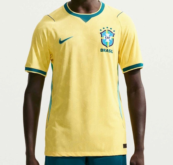Le maillot 2026 reprend la célèbre base jaune, signature visuelle emblématique de la Seleção depuis des décennies. Nike y ajoute deux nuances de bleu distinctes : un Light Mint lumineux et un Geode Teal plus profond, pour créer un contraste moderne tout en conservant une identité immédiatement reconnaissable.