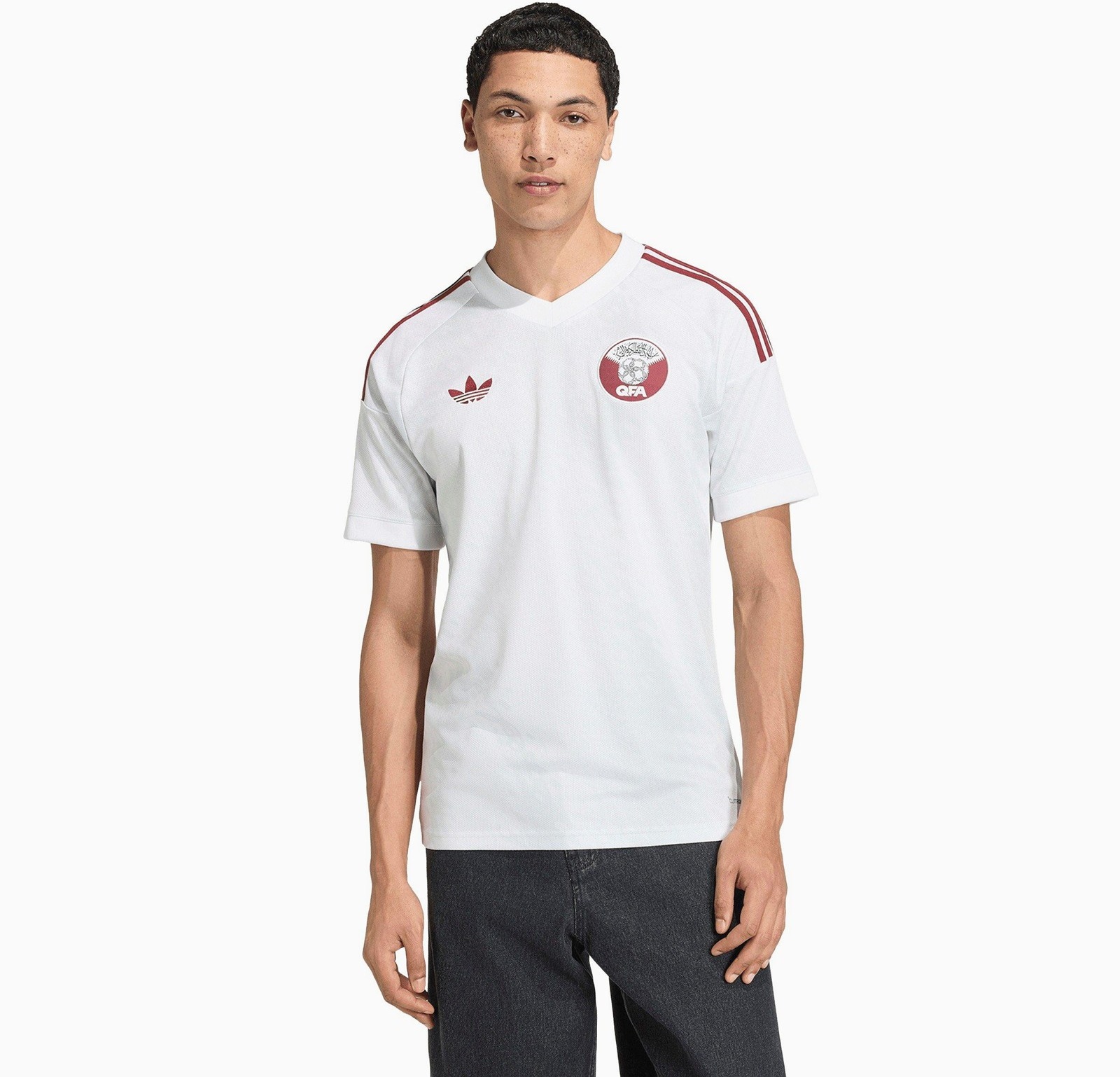 Fidèle à l’esthétique sportswear vintage qui caractérise les récentes créations d’Adidas pour les équipes nationales, ce maillot met en avant le logo Trefoil classique en bordeaux sur la poitrine droite. Les emblématiques trois bandes Adidas courent le long des épaules dans la même teinte bordeaux, en parfaite harmonie avec l’écusson de la Fédération Qatarienne de Football (QFA) positionné à gauche. Le tout est complété par un col en V blanc, simple et raffiné.